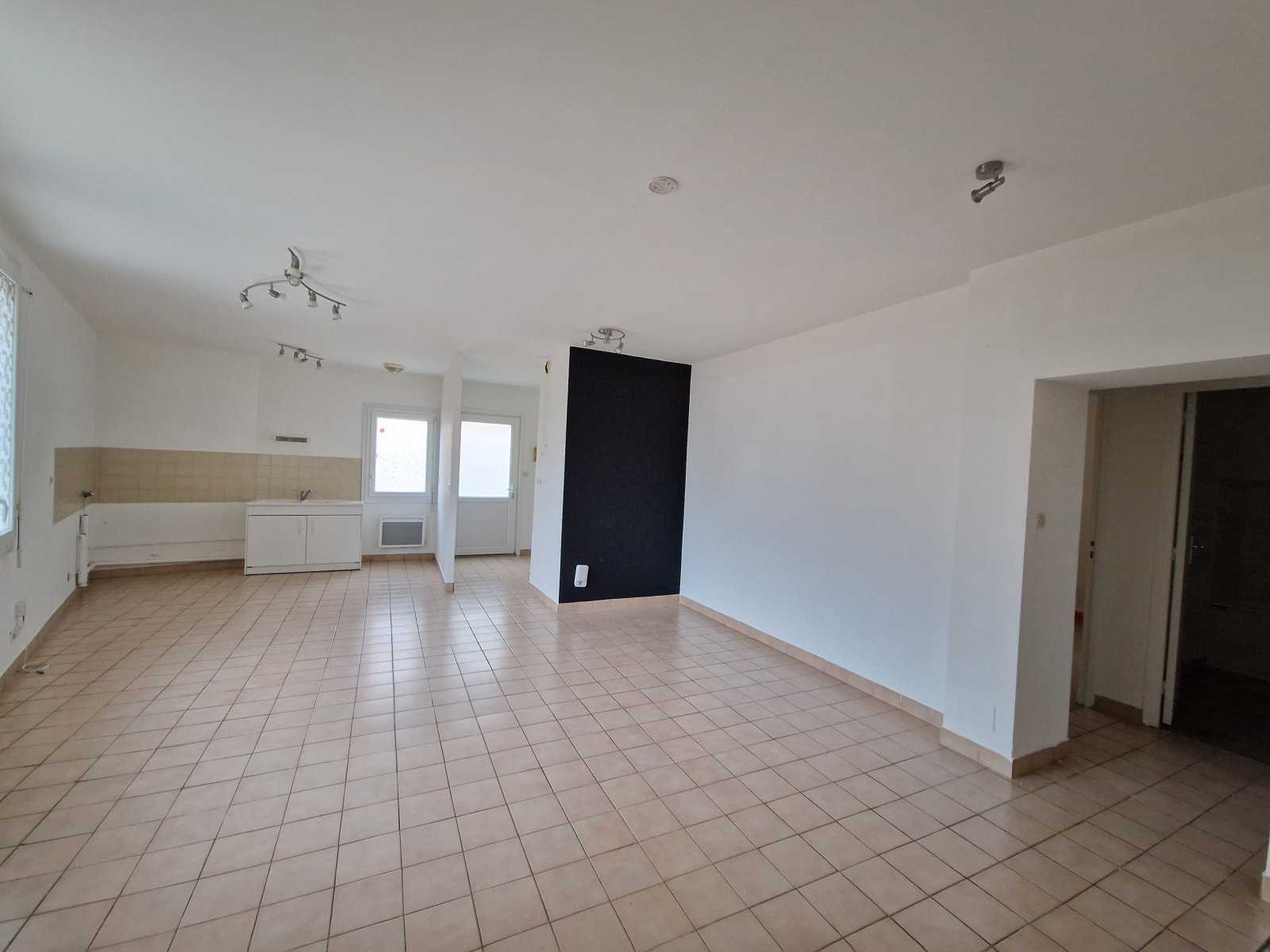 Hall d'entrée, séjour avec coin cuisine, 2 chambres de 13 et 21 m², une salle de bains et un WC séparé.
